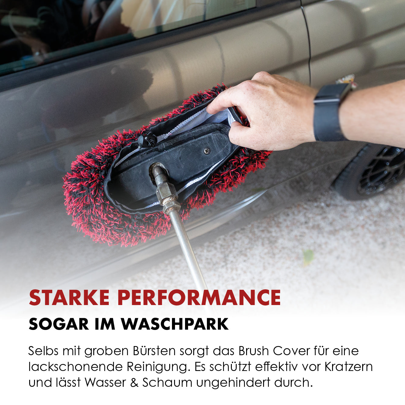 Weil Profis wissen, worauf es ankommt: Unser Brush Cover bietet maximale Schonung, uneingeschränkte Reinigungsleistung und eine durchdachte Passform, die sich jeder Waschbürste anpasst. So wird jede Autowäsche im Waschpark zur sicheren Pflege – statt zur Kratzerfalle.