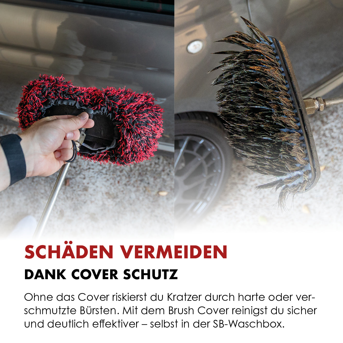 Herkömmliche Waschpark-Bürsten sind oft hart, verschmutzt und voller Risiko. Mit dem Brush Cover schützt du deinen Lack von Anfang an – für eine sichere, kratzerfreie Fahrzeugwäsche, selbst unter härtesten Bedingungen.