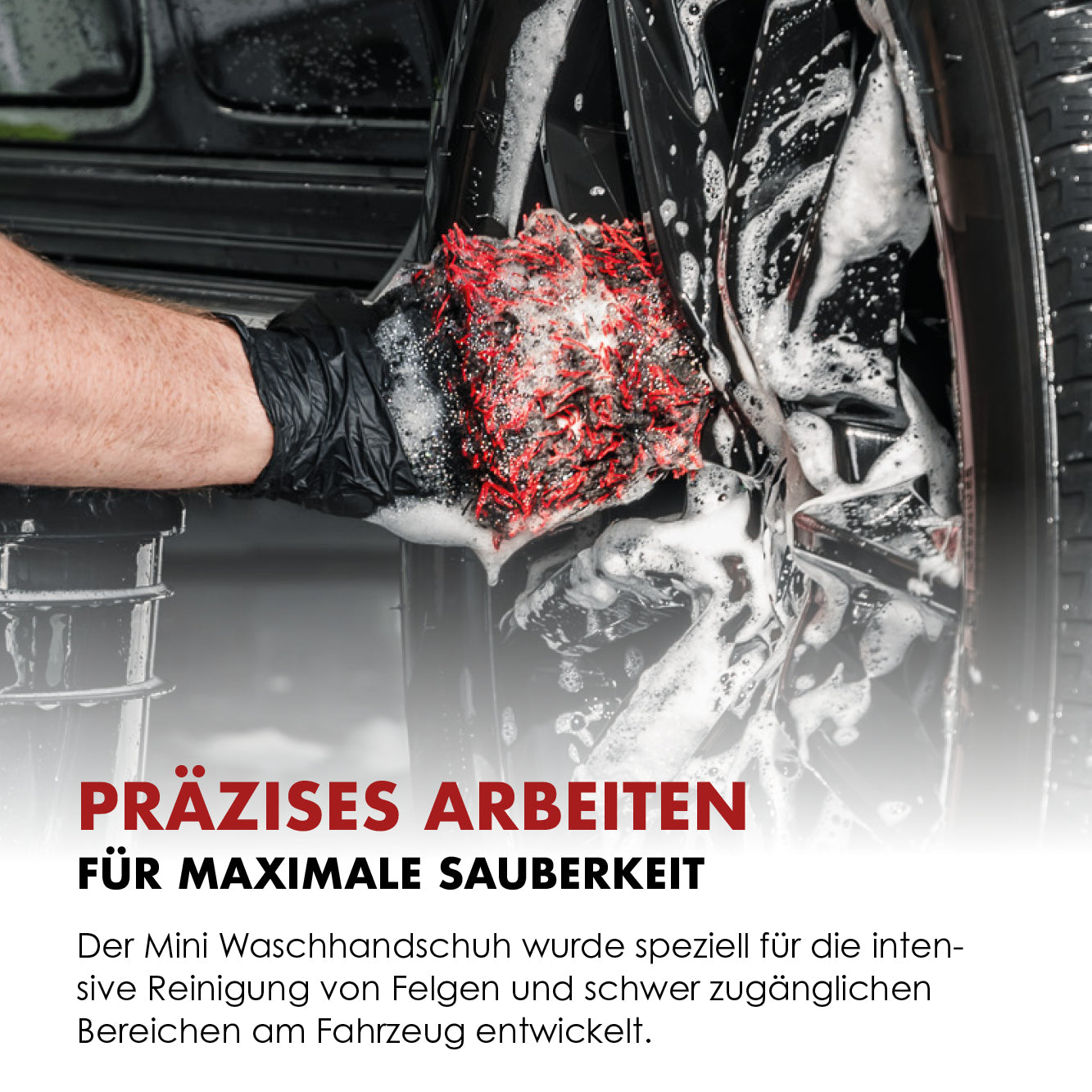 Dank kompakter Form und direktem Handkontakt ermöglicht der Mini Felgen Waschhandschuh eine gezielte, kontrollierte Reinigung – selbst in engen Zwischenräumen und an schwierigen Stellen. Ideal für Felgendesigns, bei denen es auf Genauigkeit ankommt.